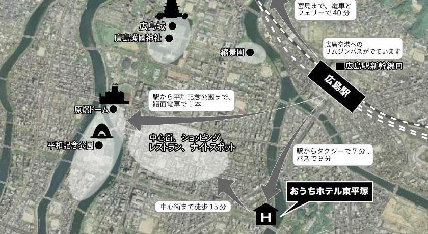 セノタフ(1.64km),原爆ドーム(1.47km),原爆の子の像(1.67km),平和祈念館(1.65km),平和記念公園(1.64km),平和の鐘(1.65km),広島城(1.94km),広島お好み村(800m),広島平和記念資料館(1.54km),縮景園(1.4km)