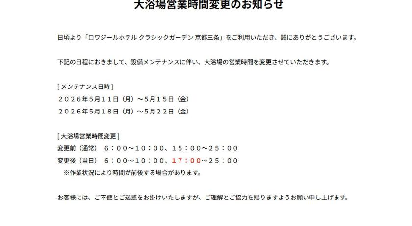 ロワジールホテルクラシックガーデン京都三条では、卓越したサービスと一流のアメニティが、お客様の思い出に残る体験を演出します。 ご滞在中もインターネットを無料でご利用いただけます。 コンシェルジュサービスを備えたフロントデスクでは、お客様のご要望にお応えします。 ゆったりとした日中や夜には、ルームサービスなどの館内設備・サービスでご滞在を存分にお楽しみいただけます。喫煙は、当宿泊施設によって指定された喫煙ゾーンでのみ許可されています。 ロワジールホテルクラシックガーデン京都三条の客室は、快適で家庭的な雰囲気をお客様に提供するために、心を込めて作られ、飾られております。 エアコンやリネンサービスを備えた客室もあり、快適にお過ごしいただけます。 一部の客室では、コーヒーや紅茶を淹れるのに必要なものがすべて揃っております。 バスローブ、タオル、または一部の客室バスルームで利用できるヘアドライヤーをご利用可能ですので、清潔を維持し、快適にお過ごしください。 ロワジールホテルクラシックガーデン京都三条では、毎朝おいしい朝食をご用意しております。 ロワジールホテルクラシックガーデン京都三条では、便利な自動販売機で24時間いつでもお手頃価格の軽食をお楽しみいただけます。