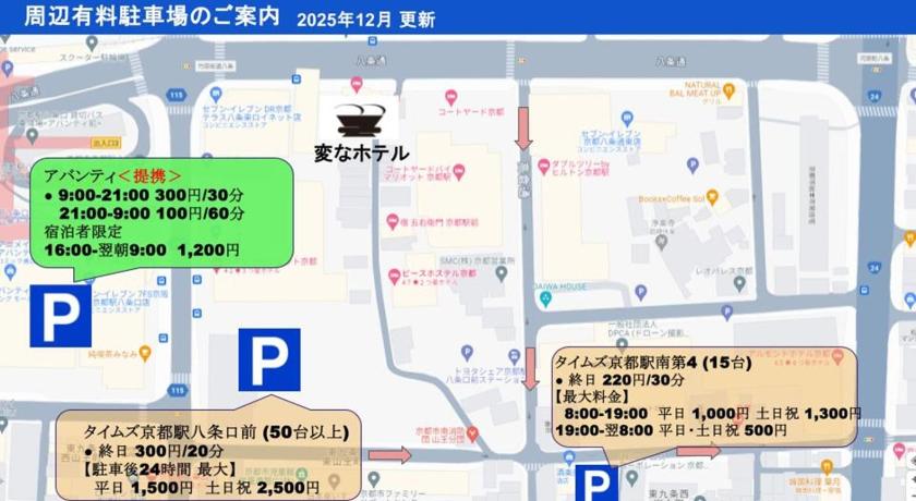 変なホテル京都八条口駅前で、比類ない設備と機能の数々をご体験ください。 ご滞在中もインターネットを無料でご利用いただけます。ご宿泊のお客様は、当宿泊施設の駐車場をご利用いただけます。コンシェルジュサービスなどのフロントデスクサービスもご利用いただけます。変なホテル京都八条口駅前で提供されるランドリーサービスを利用して、お好みの服装で常にベストな装いを。ゆったりとした日中や夜には、ルームサービスなどの館内設備・サービスでご滞在を存分にお楽しみいただけます。 健康上の理由により、当宿泊施設内は全面禁煙です。 喫煙は、当宿泊施設によって指定された喫煙ゾーンでのみ許可されています。 変なホテル京都八条口駅前の客室は、快適で家庭的な雰囲気をお客様に提供するために、心を込めて作られ、飾られております。 エアコンやリネンサービスを備えた客室もあり、快適にお過ごしいただけます。一部の客室では、室内でのビデオストリーミング、日刊新聞、テレビなどの娯楽をお楽しみいただけます。コーヒーや紅茶を淹れるのに必要なものがすべて揃っている客室もあるので、喉が渇いても安心です。バスローブ、タオル、ドライヤーは一部のゲストルームにご用意しております。 変なホテル京都八条口駅前では、毎朝おいしい朝食をご用意しております。当宿泊施設では、食欲が湧いたときにいつでも満足できるよう、簡単に利用できるおいしい食事の選択肢を豊富に提供しています。変なホテル京都八条口駅前では、便利な自動販売機で24時間いつでもお手頃価格の軽食をお楽しみいただけます。