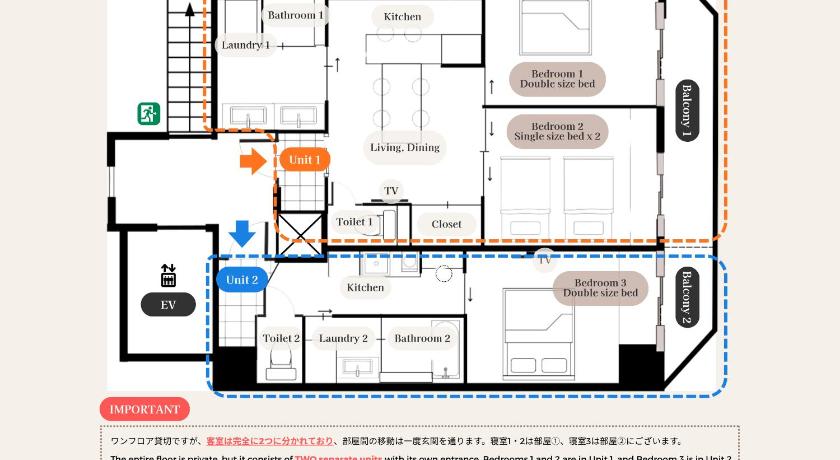 ベッドルーム 1: :シングルベッド 2台;ベッドルーム 2: :ダブルベッド 1台;ベッドルーム 3: :ダブルベッド 1台